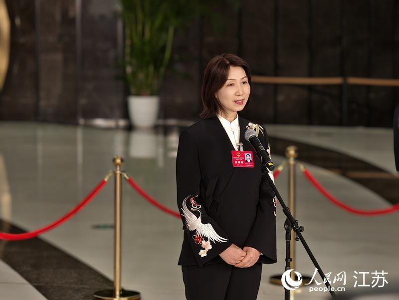 江苏省人大代表、沛县文化馆馆长王宝红在江苏省十四届人大五次会议“代表通道”上发言。人民网记者 马晓波摄